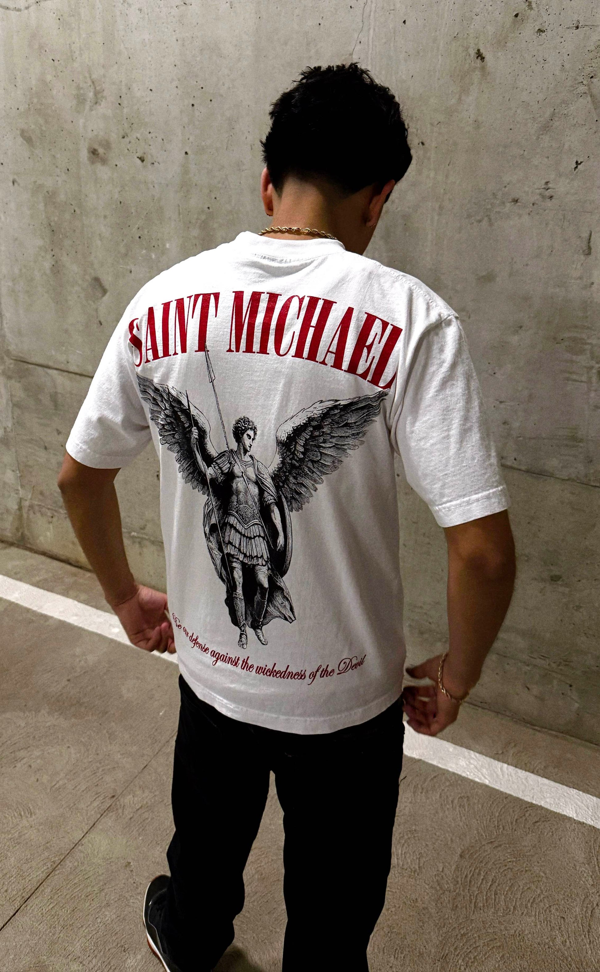 The Saint Michael Tee is a reminder that battles are fought daily, both seen and unseen. Featuring bold artwork of the Archangel Michael, this piece stands for courage, faith, and protection.